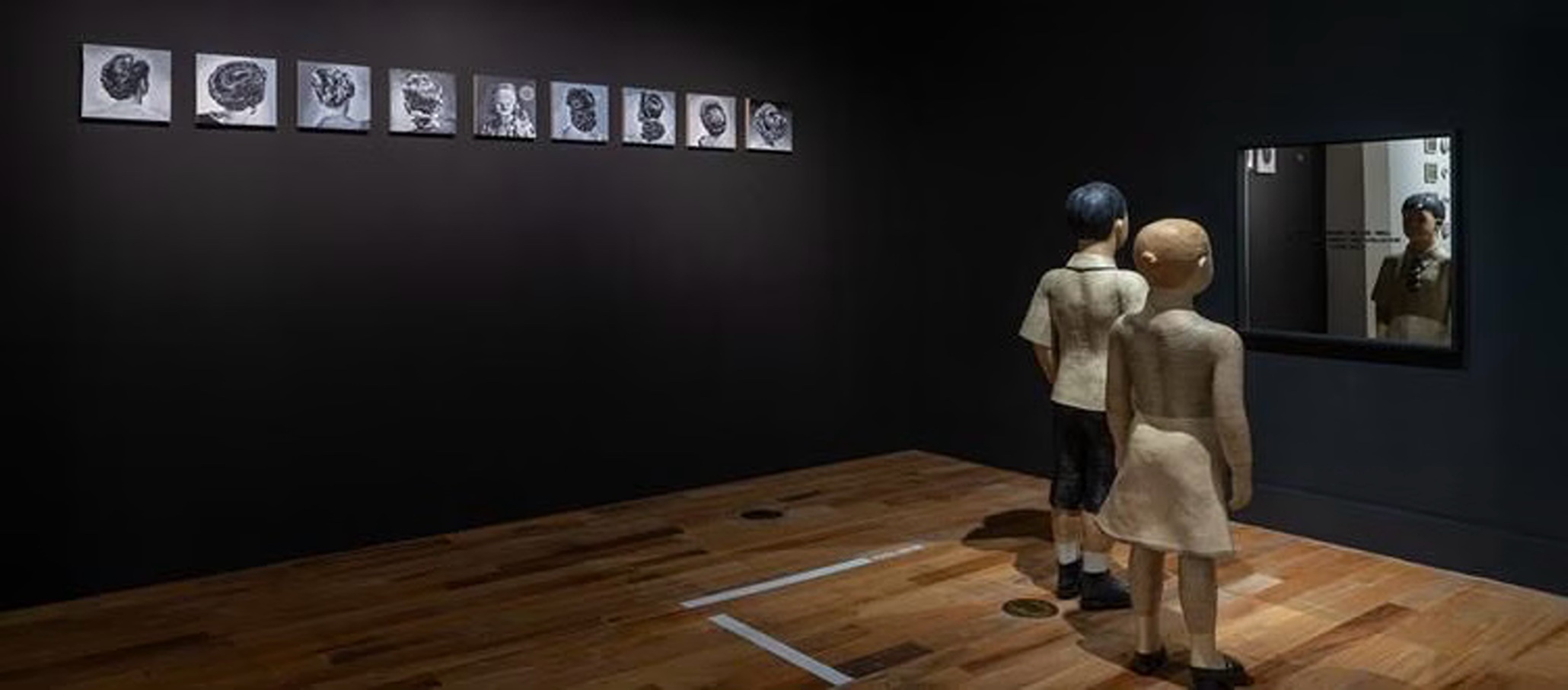 Foto de sala. En el primer plano, la imagen de la obra “Mirror Mirror”, 2016; al fondo, “I Could Have Loved You Better in the Dark”, 2025. Ambas piezas forman parte de la exhibición actual del artista Rubén Torres Llorca “Books are Burning”. Fotografía: cortesía de Aluna Art Foundation.