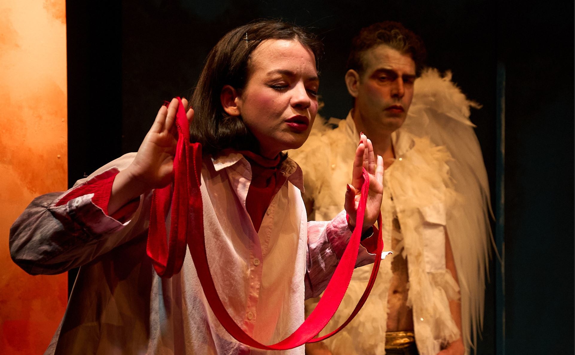Laura Alemán como Sololá y Rei Prado, en el papel del ángel Rafael, harán las cuatro funciones del 9 al 12 de abril en Miami, y luego alternarán con un segundo elenco cuando el montaje se presente en Viena, Austria, del 16 al 19 de abril (fotografía de Arturo Arocha, cortesía de Artefactus Cultural Project).