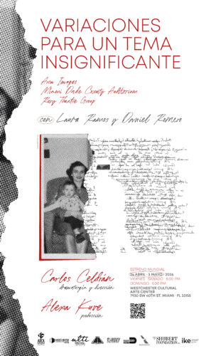 “Variaciones para un tema insignificante” reafirma a Carlos Celdrán como uno de los directores más esperados de la primavera teatral en Miami. Arca Images, bajo la dirección y producción de Alexa Kuve, ha logrado estremecer los escenarios de la ciudad con un teatro provocador y vibrante más allá de cualquier temporalidad y frontera.