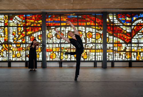 Chase Swatosh y la violinista Mei Mei Luo en foto promocional para el programa Spring Mix de Miami City ballet, que incluye el estreno para la compañía del solo “Chaconne”, con coreografía de José Limón y música de Johann Sebastian Bach. Fotografía: Chris Lockerman, The Warhol Creative (cortesía de Miami City Ballet).