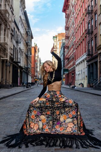 Siudy Garrido con mantón en el SoHo de Manhattan, Nueva York. Fotografía: Pedro Rodríguez (cortesía de Siudy Garrido Flamenco Company).