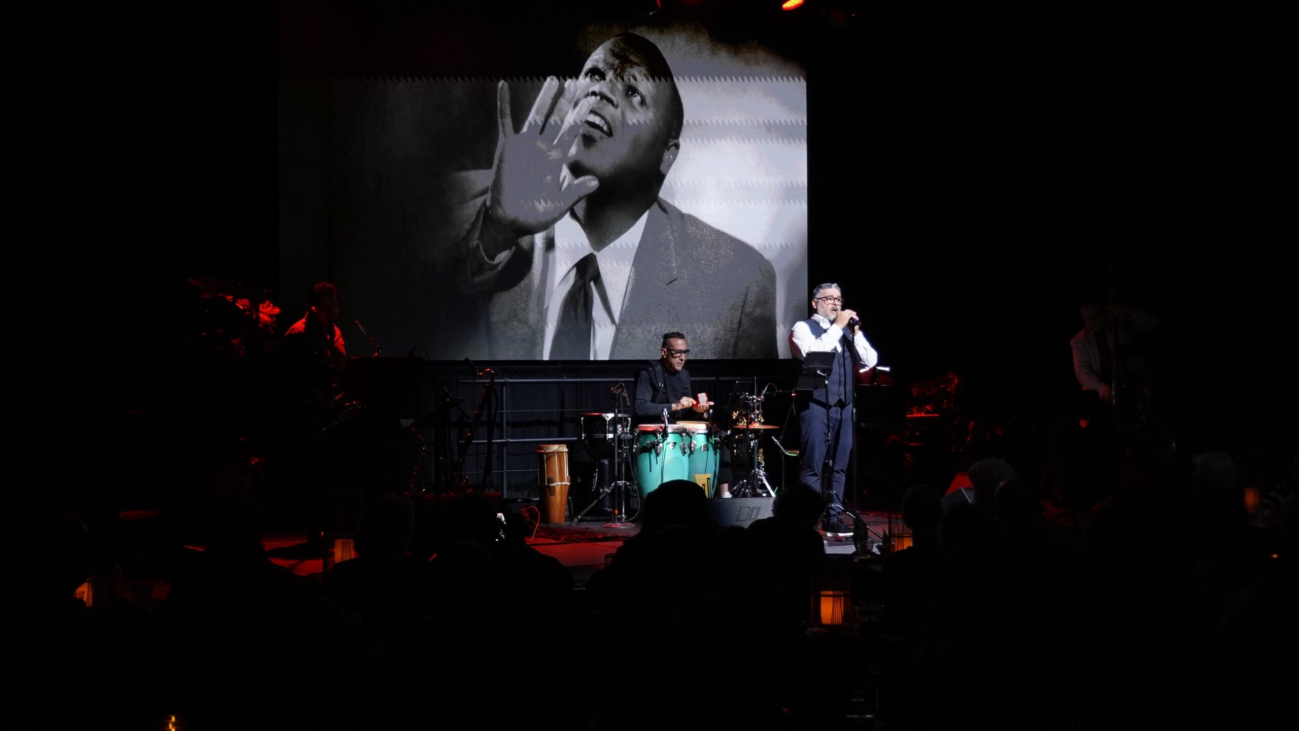 Desde una pantalla que coronaba el escenario, cada momento del show estuvo acompañado de fotografías del pianista y cantante cubano. En una especie de cronología biográfica, se veía a un niño en edad escolar; luego, otra, ya de joven, junto a su piano de cola; otras más descendiendo las escaleras de un avión de la línea Pan American, cuando la fama internacional lo alagaba y quedaba muy atrás su vieja identidad para dar paso a Bola de Nieve, la leyenda.