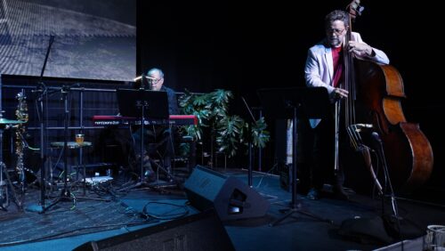 Alex Berti ejecutando el contrabajo y el pianista Félix Gómez (fotografía cortesía de Ismael Requejo).