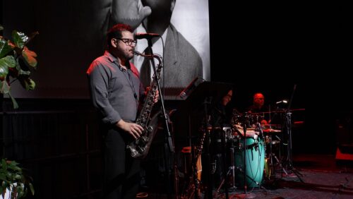 Ismael Vergara tocando el saxo junto al percusionista José Gregorio Hernández y el pianista Félix Gómez en “Si me pudieras querer… Un homenaje a Bola de Nieve” (fotografía cortesía de Ismael Requejo).