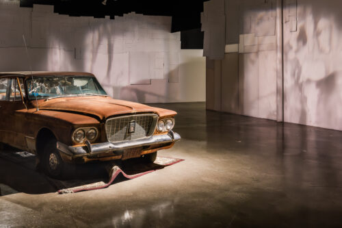 In the first stage of Kerry Phillips’ installation, the artist alludes to her father through a central element (her progenitor’s antique automobile), inescapable and immobile. (Photo courtesy of Pedro Wazzan)