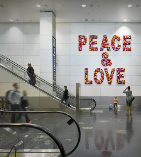 R & R Studios, PEACE & LOVE, 2013, silk flowers & EPS, 2 x 5 ft. (approx. each letter), 20 x 16 ft. (approx. overall). Photo credit Dan Forer. Courtesy of MIA Galleries, Miami International Airport.