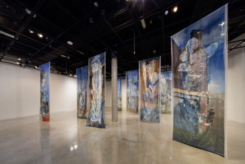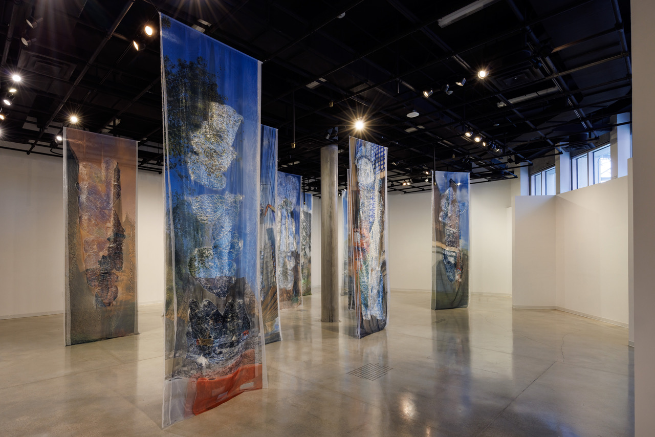 During a walkthrough of the exhibition space, the installation felt less like a series of artworks and more like entering a suspended terrain. Fifteen-foot textile panels hang from the ceiling, forming a passageway of translucent surfaces printed with photographic fragments. Moving through them, light filters across organza and woven rope, and images appear and disappear depending on perspective.