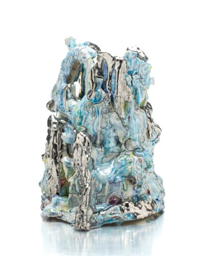 Casto’s ceramics reject the appearance of mastery commonly seen in the medium and give the illusion of disregard for detail. To look at them in the context of Meissen vases, they appear as temper tantrums in the ceramic studio, crafted with the refined materials porcelain and gold, which indicate intentionality. They are aggressive and playful and obstinate in their refusal to be “beautiful.” Rather, this term becomes expanded in his hands where gloopy and globby are not pejorative terms. The ceramics sometimes appear as if seen under a waterfall from the skillful modulation of the glazing.