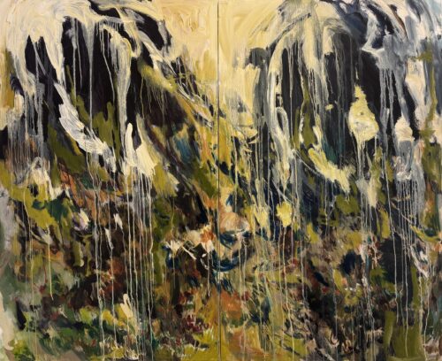 These paintings are luscious and evoke bushes, foliage, the landscape of one’s yard. Like Casto, they refuse to be pinned down, remain in flux.