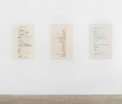 At the gallery’s far end, Katelyn Kopenhaver’s work provides a sardonic, deadpan counterpoint. Her screen-printed lists, like “Things Miami Does Not Need More Of” (like Bentleys for instance), are at once funny and incisive.