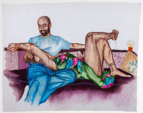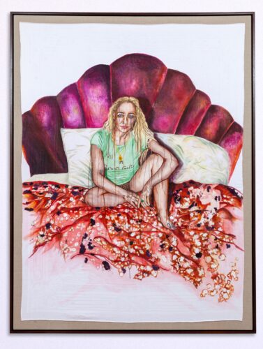 Zoë Buckman’s new solo exhibition, “Who By Fire,” takes its name from Leonard Cohen’s reworking of the High Holiday prayer “Unetaneh Tokef,” the liturgy that contemplates who will live and who will die in the upcoming year. In Buckman’s hands, that charged refrain becomes a textile language – ink, paint, appliqué, and dense hand-embroidery — stretched across vintage domestic linens. The works are unabashedly intimate and insistently public at once: portraits and self-portraits in the rooms where bodies rest, grieve, recover, and brace.