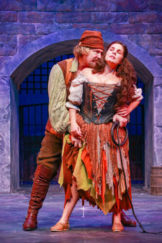 Michael Hunsaker as Captain of the Inquisition/Pedro has his grips on Aldonza, played by Gaby Tortoledo, in Actors’ Playhouse’s production of the musical “Man of La Mancha.” (Photo by Alberto Romeu)