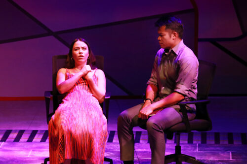 Allie Beltran as Megan Hipwell confides in her therapist played by Nate Promkul in “The Girl On The Train” at Actors’ Playhouse, Coral Gables. (Photo by Alberto Romeu/courtesy of Actors’ Playhouse)