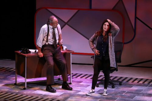 The minimalist setting by Brandon M. Newton consists of a backdrop that resembles puzzle pieces, a constant reminder of Rachel’s jumbled memory. Different areas of the stage are playing areas for locales – Rachel’s untidy flat; the Hipwell’s house (with a bar cart as its centerpiece); Tom and his new wife’s place; the two chairs that represent the therapist’s office; and the detective’s workspace.