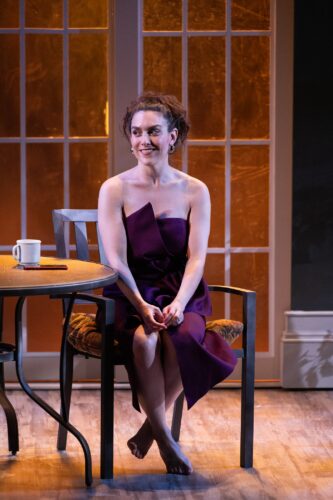 The realistic set design, which takes place in Chaya’s parents’ home in suburban, Washington, D.C., is decorated for 2006 for the first act including a 2001 working Apple iMac, sourced in Boca Raton (props and set dressing by Jameelah Bailey), and then, voila, theater magic as the living room with a kitchen remodel is updated for Act III for 2024. In the second act, the action takes place on the back porch outfitted with a working hot tub.