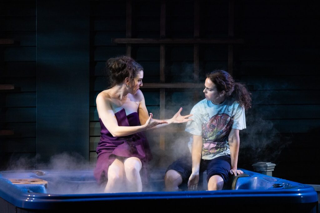 Dani Stoller as Chaya and Arielle Goldman as Izzy on the back porch set with working hot tub in Miami New Drama’s “Birthright.” (Photo by Morgan Sophia Photography/courtesy of Miami New Drama)