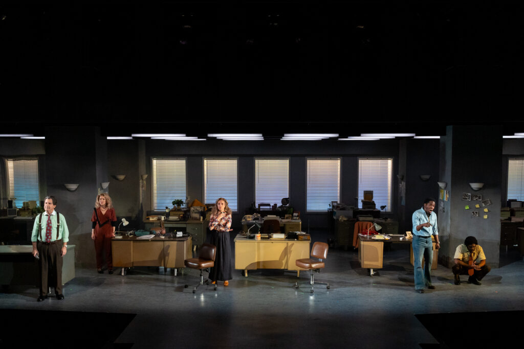 Another flaw is the play’s double standard. Granted, in the newsrooms of the early ‘80s, not an eye was batted when an editor referred to a female reporter as “Sweet Cheeks,” exactly the phrase that the play’s fictional editor Larry (Stephen Trovillion) tosses around in reference to Buchanan. But things get cringeworthy at the end of Act II when that same editor tells the audience that he thought of asking Buchanan out on a date when she first arrived in the newsroom, then shares that he was warned by a colleague that “if her pager went off during a hand job, you’d be on your own. . . .”