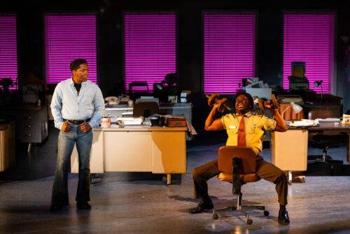 The Miami Herald newsroom, which doubles as police headquarters, is wonderfully executed for the time period by set designer Tim Mackabee enhanced by the throwback era prop design by Ana Maria Morales. Kudos to costume designer Celeste Jennings for capturing Buchanan’s love for pantsuits along with wig designer Carol Raskin whose different styles help create individuality for the multiple cast of supporting characters. Lighting designer Marie Yokoyama casts Miami 1980 in a blue haze, then ignites menacing red fire outside the building when the city is under siege. Co-sound design by Bailey Trierweiler, Daniela Hart, and Noel Nichols of Uptown Sound captures the era.