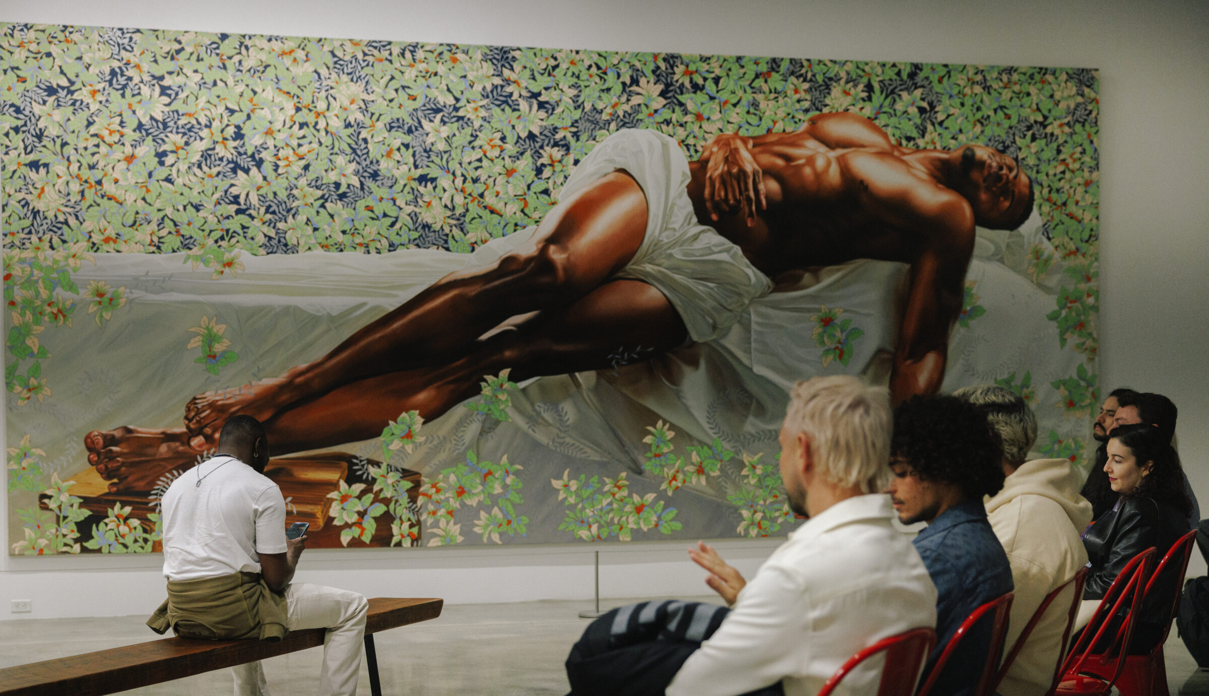 In one of six of Miami New Drama’s “The Museum Plays,” Jovon Jacobs sits in front of Kehinde Wiley’s masterpiece “Sleep” in Aurin Squire’s play “Maybe Love” at the Rubell Museum. (Photo courtesy of James Jackman)