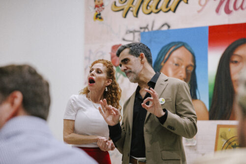 Margery Lowe and Carlos Orizondo haggle over art and bitcoins in Harley Elias’s “Pump and Dump,” one of Miami New Drama’s “Museum Plays” at the Rubell Museum. (Photo courtesy of James Jackman)