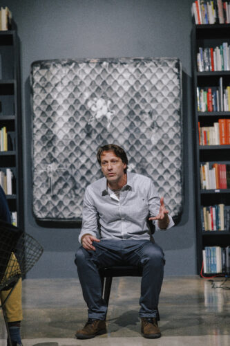 Rogelio Martinez has crafted a clever, moving piece of meta theater in “Bedfellows.” Inspired by the late Kaari Upson’s 2014 work “Rubells” – which looks very much like a worn-out mattress hanging on the wall of the museum’s library – the play features Caleb Scott as Martinez. He initially butts heads with Hausmann (played by Hannah Benitez, who wrote “Mousa” for “The Museum Plays”) as the artistic director sends back early drafts of a script and pushes Martinez to do more, see more.
