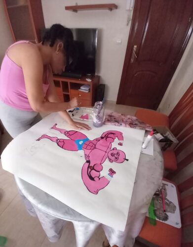 Her drawings — often reaching two or three meters (about 6.5 to 10 feet) — depict exaggerated, muscular bodies rendered in pencil and watercolor, then cut, colored and reassembled on the wall. Some figures raise their arms in poses that suggest bodybuilders or mythic heroes. Others wear tiny undergarments marked with a letter inside a heart. The repetition is deliberate. The scale is insistent.
