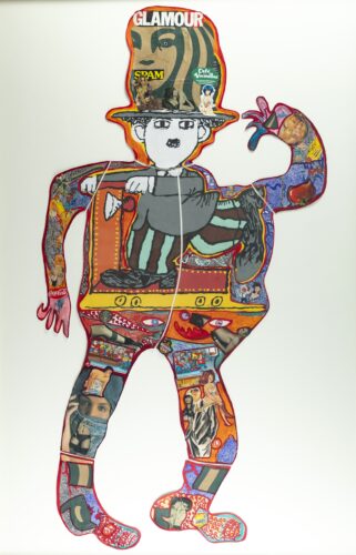 While Castillo’s work expands from within the constraints of domestic space, another artist in the exhibition relies on fragments of public imagery.